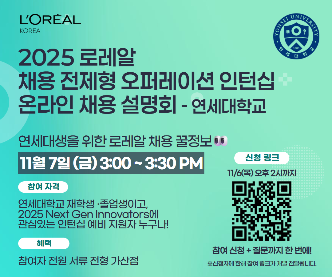 - [로레알코리아] 2025 오퍼레이션 채용전제형 인턴십/온라인 채용설명회 & 오피스 초청행사 (~11/23(일))