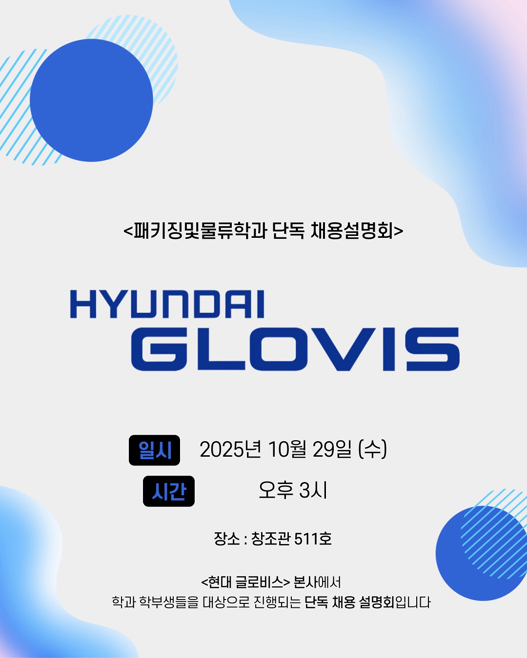 - 현대글로비스 채용 설명회(10월 29일(수) 15:00 창조관 511호)