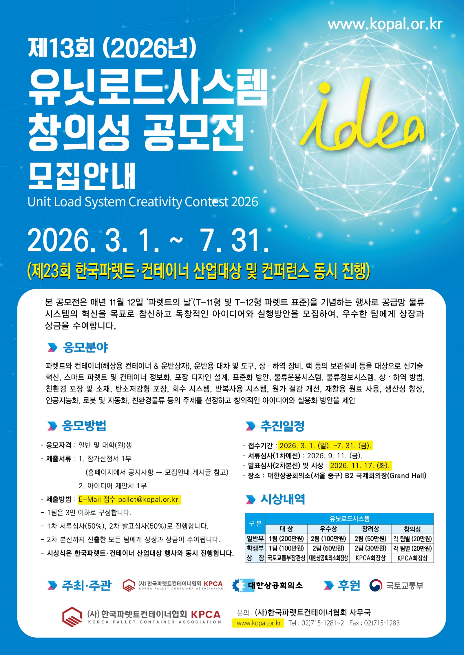 - 제13회 유닛로드시스템(ULS) 창의성 공모전 안내 (기간: 2026. 03. 01.(일) ~ 07. 31.(금)까지)